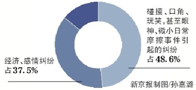 以陜西西安臨潼區(qū)檢察院所辦案件為例,因碰撞、口角、玩笑,甚至眼神、微小日常摩擦事件引起的糾紛占48.6%,經(jīng)濟(jì)、感情糾紛占37.5%