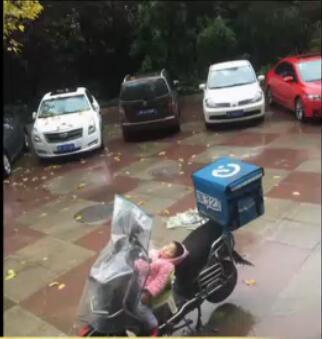 小女孩雨中躺在電動(dòng)車上睡覺