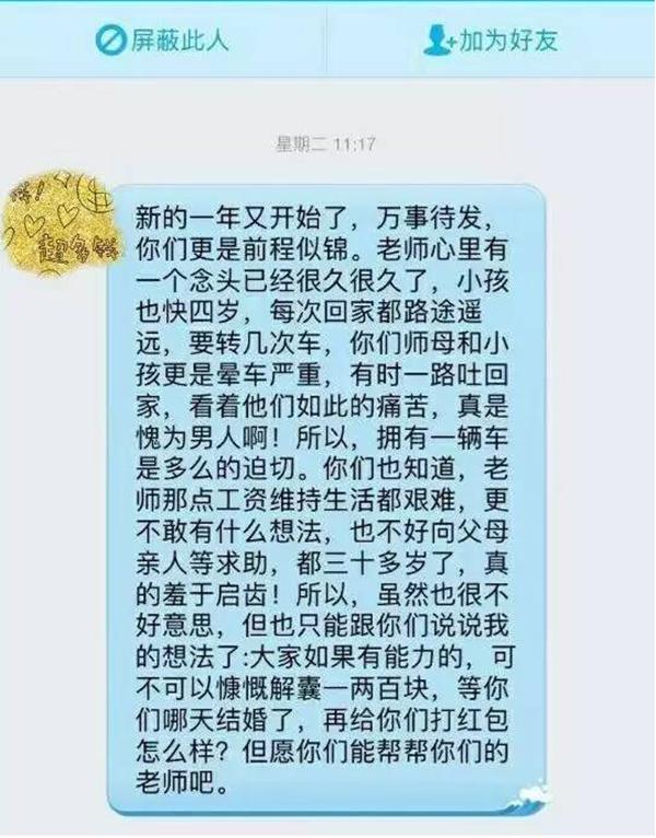 網(wǎng)帖中還上傳了數(shù)張疑似該老師與學生的QQ聊天截圖,其中的一張截圖中的對話道出了老師“眾籌”買車的原因:“新的一年又開始了,萬事待發(fā),你們更是前程似錦。老師心里有個念頭已經(jīng)很久了,小孩也快四歲了,每次回家都路途遙遠,要轉幾次車,你們師母和小孩更是暈車嚴重,有時一路吐回家,看看他們?nèi)绱送纯?,真是愧為男人啊!所以,擁有一輛車是多么的迫切。你們也知道老師那些工資維持生活都很艱難,更不敢有什么想法,也不好向父母親人求助,都三十多歲了,真的羞于啟齒!所以,雖然也很不好意思,但是也只能跟你們說說我的想法了:大家如果有能力的,可不可以慷慨解囊一兩百塊,等你們哪天結婚了,再給你們打紅包怎么樣?但愿你們能幫幫你們的老師吧。”