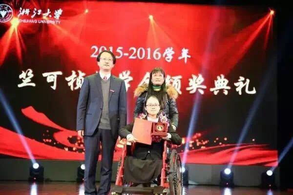 竺可楨獎學金是浙江大學最高層次的獎學金,要通過本人申請,學院(系)推薦,校獎學金評審委員會評定,每次評選全校范圍內的研究生只有12個名額。在2016年10月份公布的獲獎者中,葉沈俏名列其中。“自己算比較幸運的,還能看書,可以打字。”葉沈俏說,“同學和老師還是很關愛我的,努力學習、認真科研是向他們表達感謝的手段,這也是我最好的興趣。”圖為浙江大學校長吳朝暉為葉沈俏頒發(fā)竺可楨獎學金。