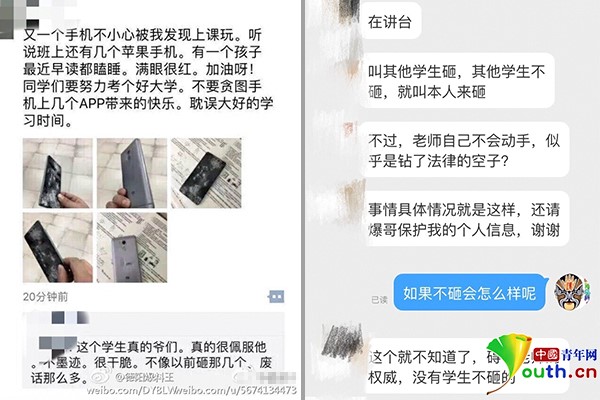 據(jù)微博內(nèi)容顯示,德陽一中學(xué)老師發(fā)現(xiàn)學(xué)生上課玩手機(jī)后要求學(xué)生將手機(jī)砸壞,事后在朋友圈贊賞該同學(xué)“耿直”,這種做法也引來爭議。有人表示,砸手機(jī)能讓學(xué)生記住教訓(xùn),避免再犯。而有的學(xué)生則表示,直接砸手機(jī)這種做法太過簡單粗暴,也可以交給家長,畢竟手機(jī)價格也不低。