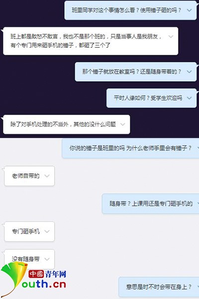 另一位目睹當(dāng)晚情況的同學(xué)向中國青年網(wǎng)記者反映,手機(jī)是被老師拿錘子砸的,該老師男性,其專門備有一個砸手機(jī)的錘子。雖然老師平時對學(xué)生們很嚴(yán)厲,但教學(xué)水平很不錯。這次雖然學(xué)生有錯,但老師砸手機(jī)的處理方式有些欠妥。