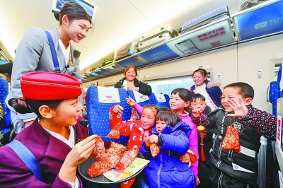 1月24日,在重慶開(kāi)往福州的G1755次列車上,乘務(wù)員和“小候鳥”做游戲。春運(yùn)期間,大批務(wù)工人員子女隨長(zhǎng)輩踏上與父母團(tuán)聚的旅途,南鐵福州客運(yùn)段提前對(duì)重點(diǎn)線路乘務(wù)組進(jìn)行兒童陪護(hù)培訓(xùn),在列車上準(zhǔn)備了書本和玩具,用愛(ài)心護(hù)航“小候鳥”的團(tuán)圓路。新華社記者 宋為偉攝