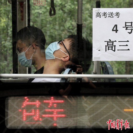 7月7日上午,四川省成都市,剛剛參加完高考語文考試的一位考生坐在車上閉目養(yǎng)神。由于考點不在本校,這位學生所在的學校安排了專車接送考生。中青報·中青網(wǎng)記者 王鑫昕/攝