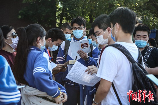 7月7日上午,北京市中國人民大學附屬中學朝陽學校(東校區(qū))門口,考生們在進入考場前抓緊時間看復習資料。中青報·中青網(wǎng)見習記者 孔斯琪/攝