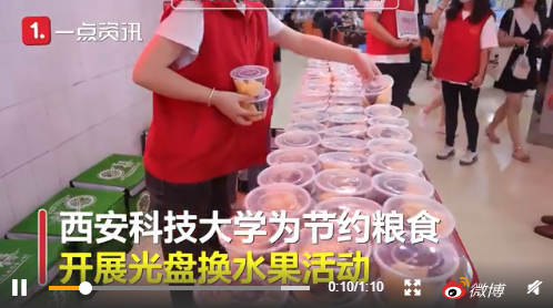 西安科技大學(xué)為節(jié)約糧食開(kāi)展了光盤(pán)換水果的活動(dòng),學(xué)生們只要把飯菜吃完清盤(pán),就可以換到一份飯后果盤(pán)和代金券。校方介紹,他們每餐準(zhǔn)備了500份水果,該活動(dòng)推出之后,收餐量減少了40%到50%。