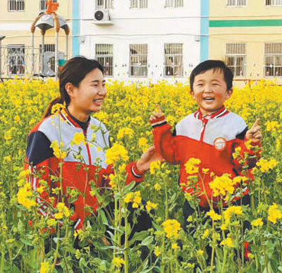 河北省大名縣黃金堤鄉(xiāng)金鄉(xiāng)水岸幼兒園老師給孩子講解油菜花。人民日報記者 張騰揚攝