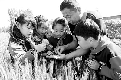 2021年5月21日,山東省高密市豪邁小學師生來到麥田“寫作業(yè)”,他們在農民伯伯的指導下零距離觀察小麥,學習“小滿”節(jié)氣的農耕常識。光明圖片