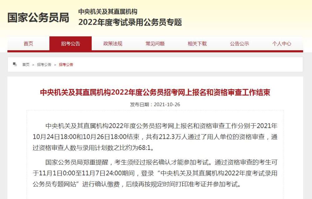 據國家公務員局網站消息,中央機關及其直屬機構2022年度公務員招考網上報名和資格審查工作分別于2021年10月24日18:00和10月26日18:00結束,共有212.3萬人通過了用人單位的資格審查,通過資格審查人數與錄用計劃數之比約為68:1。