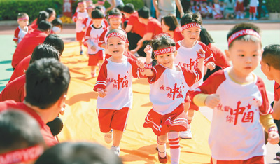 11月13日,在海南省??谑锌缡兰o(jì)成龍幼兒園秋季親子運(yùn)動(dòng)會(huì)上,家長和孩子們一起體驗(yàn)運(yùn)動(dòng)帶來的快樂,加深了彼此間的情感交流。袁 琛攝(人民視覺)
