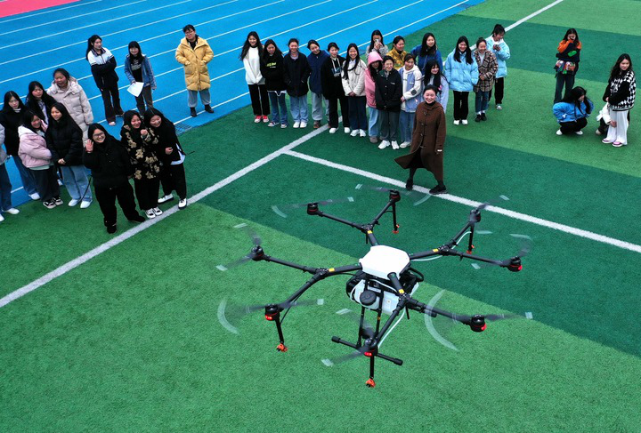 2022年3月2日,在宣恩縣中等職業(yè)技術(shù)學(xué)校,學(xué)生觀摩植保無人機飛行操作(無人機照片)。新華社發(fā)(宋文攝)