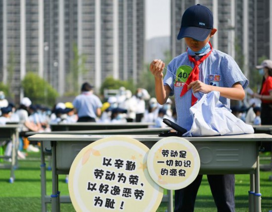 2021年11月10日,陜西平利縣城關(guān)第三小學(xué)3年級(jí)1班的學(xué)生在學(xué)校內(nèi)務(wù)整理室內(nèi)學(xué)習(xí)疊衣服。 新華社記者 邵瑞 攝
