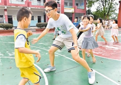2022年暑期,武漢大學(xué)的大學(xué)生志愿者來(lái)到江西省南昌市灣里管理局羅亭鎮(zhèn)義坪小學(xué)參加“童心港灣”關(guān)愛(ài)留守兒童活動(dòng)。圖為志愿者和留守兒童一起做游戲。新華社發(fā)