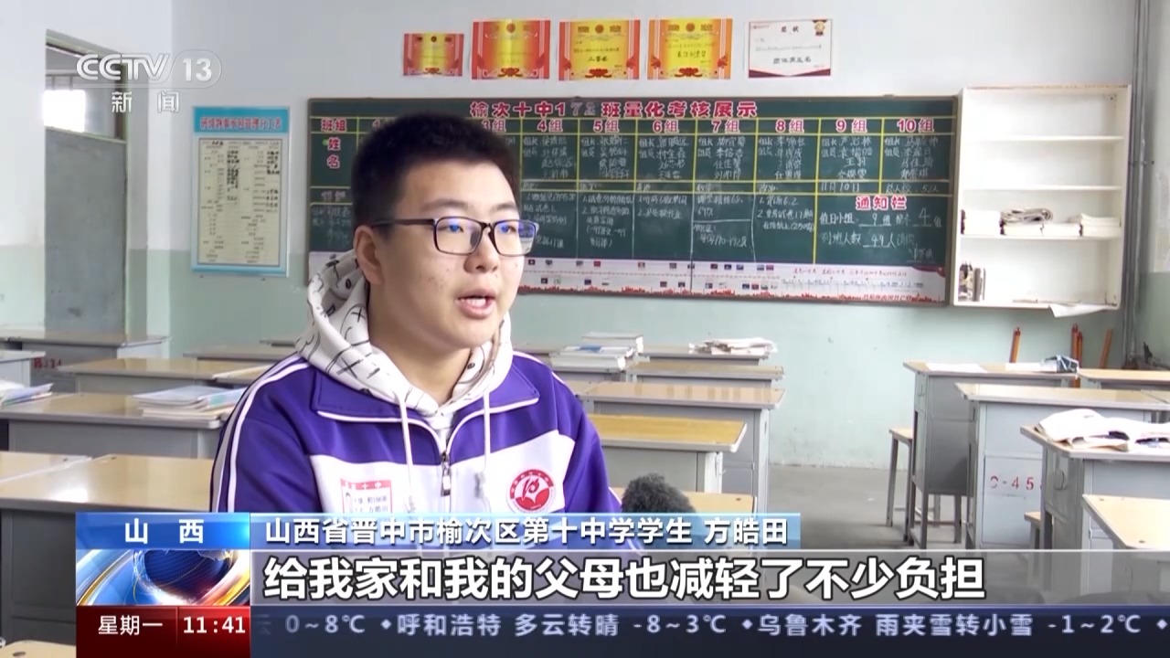山西省晉中市榆次區(qū)第十中學(xué)學(xué)生 方皓田:學(xué)校為我們每個(gè)學(xué)生都上了校方責(zé)任險(xiǎn),算下來(lái)醫(yī)療費(fèi)除醫(yī)保報(bào)銷(xiāo)部分以外,剩余的12000多元都給我報(bào)銷(xiāo)了,給我家和我的父母也減輕了不少負(fù)擔(dān)。