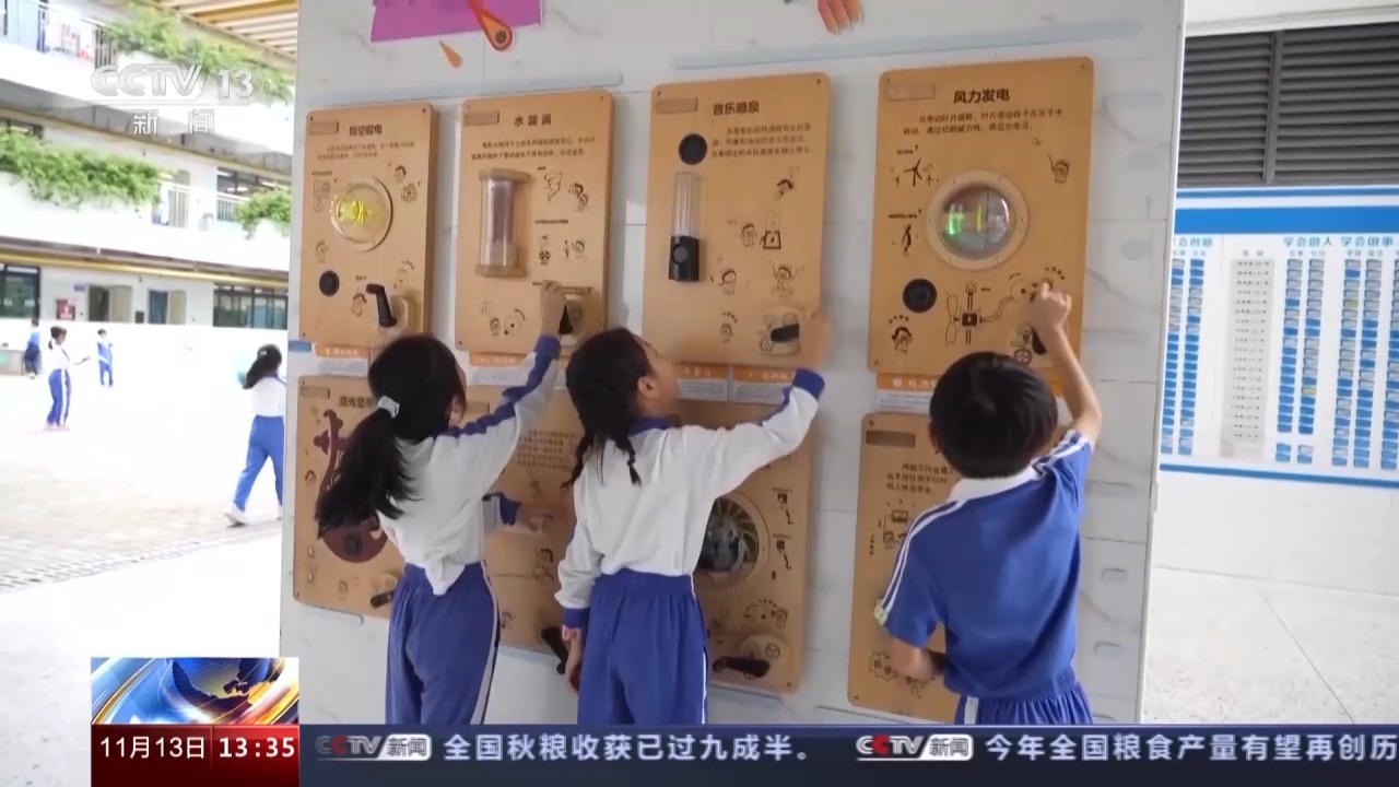 如果同學(xué)們課間不想運(yùn)動(dòng),學(xué)校還在每層布置了科學(xué)互動(dòng)角,“發(fā)電輪”“燈光隧道”“音樂(lè)噴泉”“水漩渦”等十幾個(gè)交互式科技項(xiàng)目也在課間對(duì)同學(xué)們開(kāi)放。