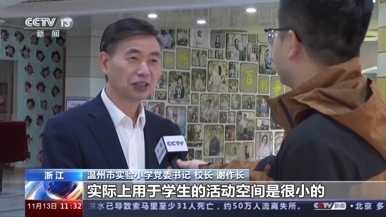 溫州市實(shí)驗(yàn)小學(xué)黨委書(shū)記、校長(zhǎng) 謝作長(zhǎng):這個(gè)6.6平方米,聽(tīng)起來(lái)好像并不小,但它包含了會(huì)議室、食堂、教師辦公室等等功能房,實(shí)際上用于學(xué)生的活動(dòng)空間是很少的,你看它只有省標(biāo)的三分之一左右呀。但是再怎么困難,課間十分鐘是必須讓孩子們放松。