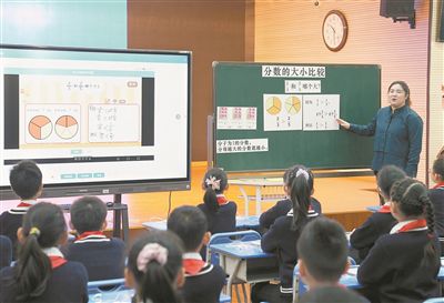 在上海市楊浦區(qū)平?jīng)雎返谌W(xué)的“教學(xué)助手”展示課上,老師在黑板上進(jìn)行知識點(diǎn)講解分析,顯示屏上有學(xué)生們的人機(jī)互動結(jié)果和學(xué)習(xí)效果的統(tǒng)計(jì)數(shù)據(jù)。 新華社記者 劉穎攝