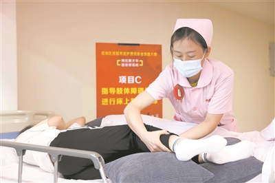在安徽省合肥市瑤海區(qū)首屆養(yǎng)老護理員職業(yè)技能大賽現(xiàn)場,選手參加護理技能比賽。新華社發(fā)(解琛攝)