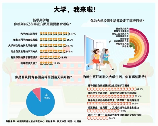 開學(xué)季,大一新生陸續(xù)報(bào)到,開啟了全新的校園生活。人際交往、學(xué)習(xí)氛圍、生活方式……各方面都需要去探索和適應(yīng)。面對(duì)嶄新的人生階段,他們準(zhǔn)備好了嗎?他們?yōu)樽约旱拇髮W(xué)設(shè)立了什么目標(biāo)? 日前,中國青年報(bào)社社會(huì)調(diào)查中心聯(lián)合問卷網(wǎng)(wenjuan.com),對(duì)1333名2024級(jí)大學(xué)新生進(jìn)行的一項(xiàng)調(diào)查顯示,新學(xué)期伊始,61.7%的受訪新生都感到大學(xué)生活節(jié)奏還需磨合適應(yīng)。提高社交能力、掌握專業(yè)真本領(lǐng)、確定人生發(fā)展方向是這屆新生最主要的3個(gè)大學(xué)目標(biāo)。 “學(xué)習(xí)方式的轉(zhuǎn)變和陌生環(huán)境的適應(yīng)是大學(xué)新生會(huì)首先碰到的兩個(gè)主要問題” 吉林大學(xué)行政法學(xué)院的大一新生胡智先已經(jīng)來校兩周了。他感慨,需要磨合的方面還挺多?!拔沂菑V東佛山人,上大學(xué)跨越了祖國的南北,在生活習(xí)慣、飲食習(xí)慣和氣候方面都要適應(yīng)。”他介紹,“老家的飯菜清淡,講究食材本味,學(xué)校的食堂則重口不少。兩地的溫度更是有著很大差異,現(xiàn)在吉林早晚的氣溫已經(jīng)是廣東12月、1月份才會(huì)出現(xiàn)的低溫了。” 陳晚雪是一所二本院校的大一新生,她從北方到了南方,也正在適應(yīng)當(dāng)?shù)氐奶鞖?。此外,她學(xué)的藝術(shù)與科技是個(gè)新專業(yè),學(xué)校今年第一次招生。“專業(yè)涉及了智能化設(shè)備、AI技術(shù)和三維動(dòng)畫等方面。因?yàn)槭堑谝粚?,學(xué)校在這方面也沒有太多積累,需要自己多探索,積極參加競賽和實(shí)習(xí),平時(shí)多與老師溝通?!?/p> 薛冰是首都師范大學(xué)2024級(jí)的大一新生,學(xué)校距離家只有1個(gè)半小時(shí)的車程。她坦言,雖然不存在要適應(yīng)城市與氣候的問題,但自己也挺緊張?!斑@里有新的朋友、新的生活環(huán)境、新的學(xué)習(xí)模式,都需要去適應(yīng)。希望能提高學(xué)習(xí)效率,維系良好的人際關(guān)系,盡快適應(yīng)大學(xué)生活?!?/p> 談及很多新生都在意的社交問題,胡智先則覺得“沒什么”?!按髮W(xué)就像一個(gè)小社會(huì),大家來自五湖四海,保持一顆平常心,更能營造健康輕松的人際關(guān)系。” 新學(xué)期伊始,大學(xué)新生感到要在哪些方面磨合適應(yīng)?61.7%的受訪新生表示是大學(xué)的生活節(jié)奏,56.7%的受訪新生認(rèn)為是和室友同學(xué)的交往相處,55.7%的受訪新生感慨是大學(xué)所在地的飲食風(fēng)俗習(xí)慣,54.8%的受訪新生認(rèn)為是完全自我主導(dǎo)的學(xué)習(xí)方式,42.9%的受訪新生指出是截然不同的教學(xué)管理模式,28.3%的受訪新生覺得是新課程接受能力。 中國人民大學(xué)教育學(xué)院教授、副院長李立國表示,學(xué)習(xí)方式的轉(zhuǎn)變和陌生環(huán)境的適應(yīng)是大學(xué)新生會(huì)首先碰到的兩個(gè)主要問題?!案咧袑儆诨A(chǔ)教育階段,大學(xué)屬于高等教育階段,后者更加重視專業(yè)教育,強(qiáng)調(diào)自主性,學(xué)生在學(xué)習(xí)的方式方法上要做出很大改變。其次,遠(yuǎn)離家人來到陌生城市,生活上各方面都需要獨(dú)立面對(duì),也需要適應(yīng)?!?/p> 大學(xué)除了學(xué)習(xí)還要提升綜合能力,這對(duì)未來的成長和發(fā)展同樣很關(guān)鍵 薛冰的目標(biāo)非常明確:“我們學(xué)校在師范類院校中的實(shí)力挺強(qiáng),本地中小學(xué)教師不少都來自我校。我的專業(yè)是歷史學(xué),是學(xué)校的特色學(xué)科。我希望能在大學(xué)4年把專業(yè)知識(shí)掌握牢靠,未來能成為一名優(yōu)秀的歷史老師?!?/p> 胡智先認(rèn)為,大學(xué)生最重要的任務(wù)就是學(xué)習(xí)。對(duì)他來說,眼前最重要的事是應(yīng)對(duì)馬上要到來的英語分級(jí)考試,“我希望能分到A班,這樣大一就能考英語四級(jí)”。胡智先一直有繼續(xù)深造的打算,“爭取將學(xué)分績點(diǎn)保持在專業(yè)前五名,這樣以后申請保研比較有優(yōu)勢。即便畢業(yè)后出國留學(xué),學(xué)習(xí)好也是先決條件?!?/p> 陳晚雪覺得大學(xué)很鍛煉人,很考驗(yàn)對(duì)時(shí)間的把控能力和自律能力?!按髮W(xué)里的時(shí)間基本上都是自己安排,如何利用完全看個(gè)人。我想把更多的時(shí)間用來拓展自己的興趣?!?/p> 大學(xué)新生為大學(xué)校園生活設(shè)定了哪些目標(biāo)?調(diào)查顯示,提高社交能力(55.6%)位列第一,其次是掌握專業(yè)真本領(lǐng)(52.4%),排在第三位、第四位的依次是確定人生發(fā)展方向(52.1%)、克服性格弱點(diǎn)(50.9%),其他還有:拿獎(jiǎng)學(xué)金(41.7%)、考過英語四六級(jí)(36.5%)、爭取盡早入黨(28.1%)、多運(yùn)動(dòng)鍛煉(27.6%)、飲食作息規(guī)律(25.9%)、去看祖國山河(24.9%)、談戀愛(20.0%)。 李立國表示,大學(xué)里樹立明確的目標(biāo)能激勵(lì)自己努力,也有助于未來職業(yè)規(guī)劃、人生規(guī)劃更加清晰合理。同時(shí)他也提醒大學(xué)新生,大學(xué)的生活是豐富多彩的,除了專業(yè)學(xué)習(xí)、考研考公等,還可以參加學(xué)生社團(tuán)活動(dòng)、實(shí)踐活動(dòng),提升綜合能力,這對(duì)未來的成長和發(fā)展同樣很關(guān)鍵。 64.5%受訪新生希望輔導(dǎo)員負(fù)責(z