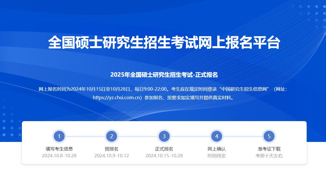 網(wǎng)上報名時間為2024年10月15日至10月28日(網(wǎng)上預(yù)報名時間為2024年10月9日至10月12日,相關(guān)工作安排由各省級教育招生考試機構(gòu)確定并公布),每日9:00-22:00??忌鷳?yīng)在規(guī)定時間登錄“中國研究生招生信息網(wǎng)”(網(wǎng)址:https://yz.chsi.com.cn)參加報名,按要求如實填寫并提供真實材料。