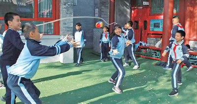 北京市東城區(qū)黑芝麻胡同小學圓恩寺校區(qū)位于一條胡同里,空間略顯局促。學校發(fā)布了“課間活動征集令”,把課間15分鐘交給學生自己設(shè)計和策劃?!熬幓ɑ@3個人就能玩,不占地方”“可以觀察、養(yǎng)護池塘邊的植物”“華容道、九連環(huán)”……學生們紛紛為課間活動支招。