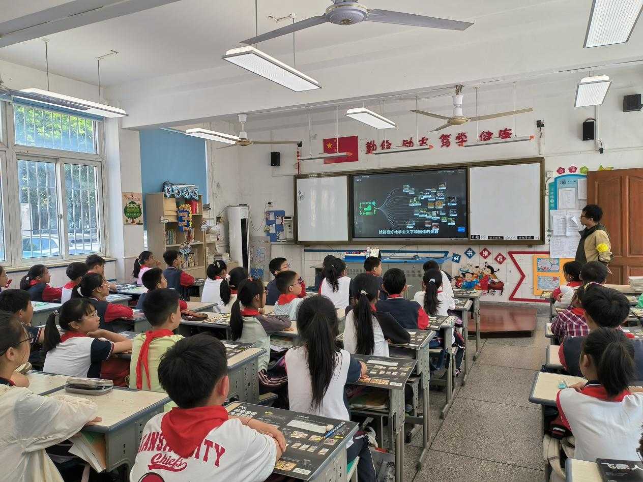 陳娟介紹,該校去年起引入“飛象人工智能通識課”,采用螺旋式進階設(shè)計,10門、160節(jié)分層進階的課程體系,貫穿真實生活場景。記者現(xiàn)場看到,在“智能雙師”授課模式下,線上大屏的老師設(shè)計課程任務(wù),線下課堂老師把控課堂節(jié)奏,組織學(xué)生互動討論,并對討論成果實時評價。