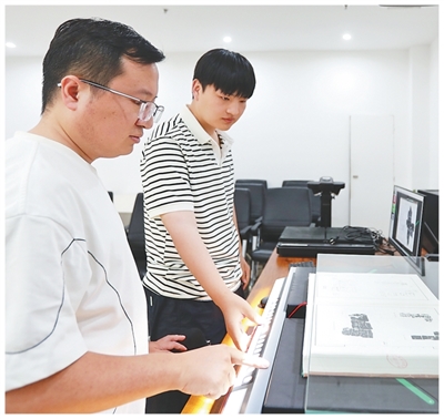實(shí)驗(yàn)室內(nèi),張展(左)正在和學(xué)生掃描錄入甲骨文拓本。霍亞平攝