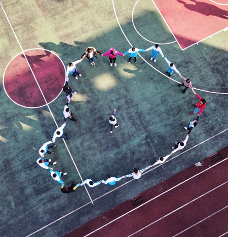 11月9日,在貴州省遵義市鳳岡縣特殊教育學(xué)校,老師帶領(lǐng)學(xué)生們?cè)诓賵?chǎng)做游戲。視覺中國(guó)供圖
