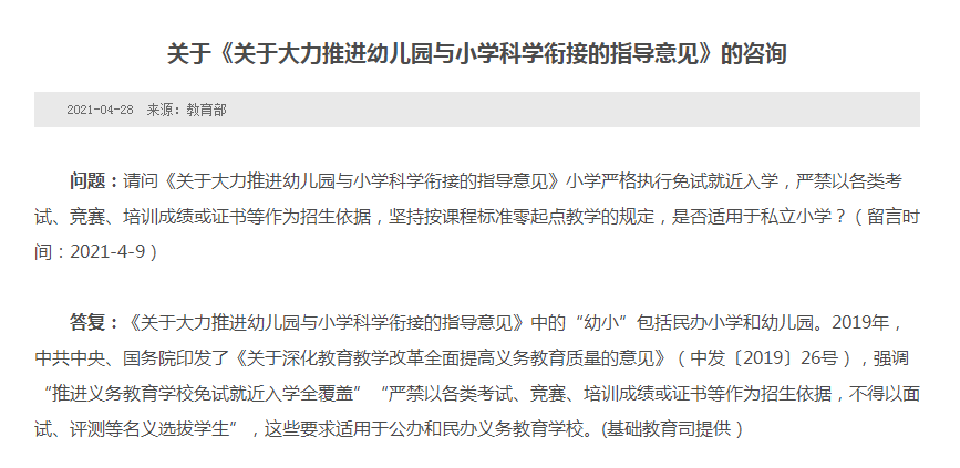 新華網(wǎng)北京4月28日電 近日,教育部在回應(yīng)網(wǎng)友咨詢《關(guān)于大力推進(jìn)幼兒園與小學(xué)科學(xué)銜接的指導(dǎo)意見(jiàn)》相關(guān)問(wèn)題時(shí)表示,該指導(dǎo)意見(jiàn)中的“幼小”包括民辦小學(xué)和幼兒園。2019年,中共中央、國(guó)務(wù)院印發(fā)了《關(guān)于深化教育教學(xué)改革全面提高義務(wù)教育質(zhì)量的意見(jiàn)》(中發(fā)〔2019〕26號(hào)),強(qiáng)調(diào)“推進(jìn)義務(wù)教育學(xué)校免試就近入學(xué)全覆蓋”“嚴(yán)禁以各類(lèi)考試、競(jìng)賽、培訓(xùn)成績(jī)或證書(shū)等作為招生依據(jù),不得以面試、評(píng)測(cè)等名義選拔學(xué)生”,這些要求適用于公辦和民辦義務(wù)教育學(xué)校。