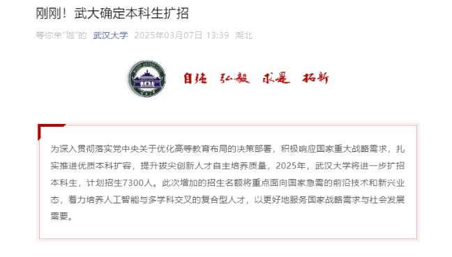 3月7日,據(jù)武漢大學微信公眾號消息,為深入貫徹落實黨中央關(guān)于優(yōu)化高等教育布局的決策部署,積極響應國家重大戰(zhàn)略需求,扎實推進優(yōu)質(zhì)本科擴容,提升拔尖創(chuàng)新人才自主培養(yǎng)質(zhì)量,2025年,武漢大學將進一步擴招本科生,計劃招生7300人。此次增加的招生名額將重點面向國家急需的前沿技術(shù)和新興業(yè)態(tài),著力培養(yǎng)人工智能與多學科交叉的復合型人才,以更好地服務國家戰(zhàn)略需求與社會發(fā)展需要。
