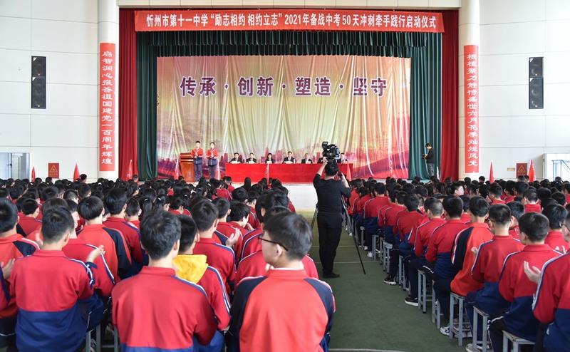 又是一年五月,陽光明媚,又逢“五四”,血脈僨張。在五月的花海中擁抱青春的時(shí)代,在初升的太陽下點(diǎn)燃生命的未來。為進(jìn)一步激發(fā)初三師生堅(jiān)定目標(biāo)、奮力拼搏、沖刺中考的雄心壯志,5月4日上午,忻州市第十一中學(xué)初三年級全體師生在學(xué)校文體藝苑舉行了“勵(lì)志相約、相約立志”2021屆備戰(zhàn)中考50天沖刺牽手踐行啟動儀式,校長張?jiān)崎L、黨支部書記趙智剛、學(xué)校領(lǐng)導(dǎo)、部分家長代表共同見證了這一振奮人心的時(shí)刻。