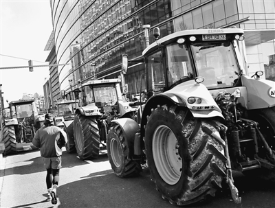 歐盟與俄羅斯之間的相互制裁導致歐盟成員國農(nóng)產(chǎn)品價格下跌,引發(fā)農(nóng)民不滿。圖為今年3月,比利時農(nóng)民將拖拉機開上布魯塞爾的街道,進行抗議示威。人民視覺