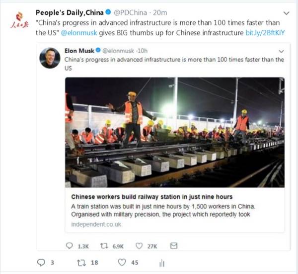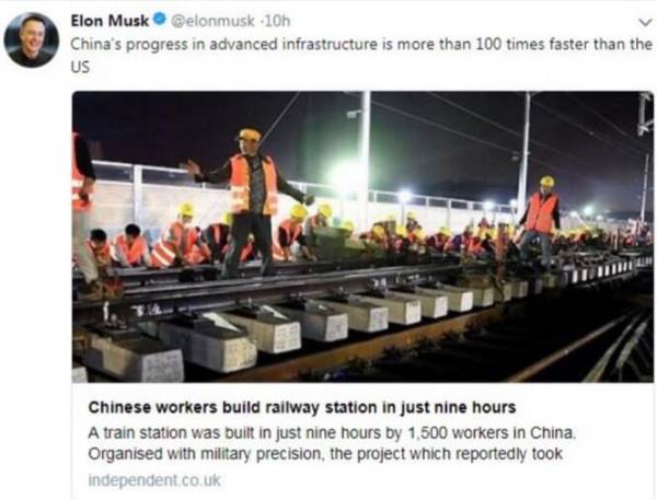 央廣網北京2月28日消息 近年來,中國速度日益引發(fā)外媒關注。今天(28日),一段中國工人在火車站施工的視頻又走紅美國,剛剛將跑車送上太空的企業(yè)家馬斯克(Elon Musk)也忍不住轉發(fā)贊嘆,“中國先進基礎設施發(fā)展速度比美國快了100多倍”。