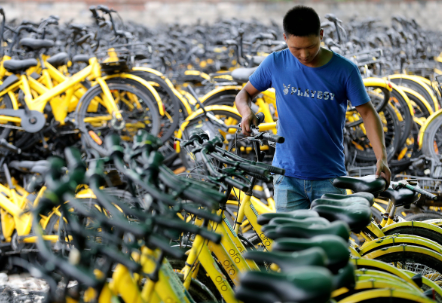 在杭州中諸葛路,4萬(wàn)輛回收的ofo單車(chē)停放在場(chǎng)地上。 視覺(jué)中國(guó)