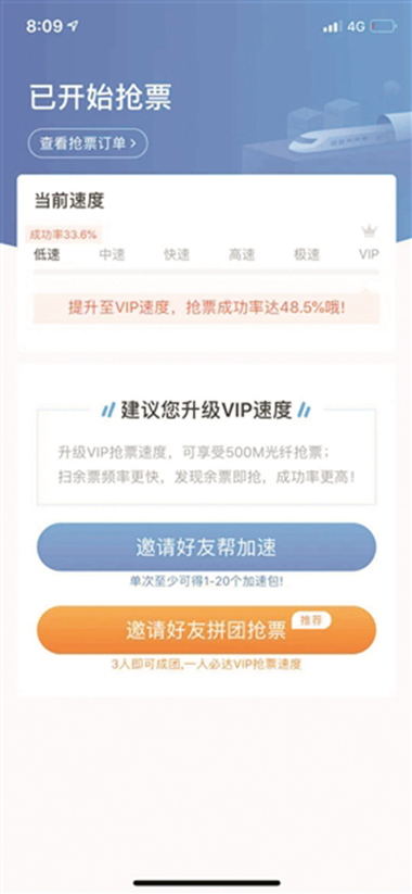 隨后,北青報(bào)記者打開(kāi)某搶票軟件,按照與之前一樣的車(chē)次信息,其出現(xiàn)了多個(gè)選項(xiàng),其中,快速搶票選項(xiàng)顯示搶票成功率為81.0%,此項(xiàng)加速包價(jià)格20元;高速搶票選項(xiàng),搶票成功率為83.5%,加速包價(jià)格30元;急速搶票選項(xiàng)顯示成功率為85.3%,加速包為40元。而在VIP選項(xiàng)中,搶票成功率為86.8%,此項(xiàng)加速包為50元。