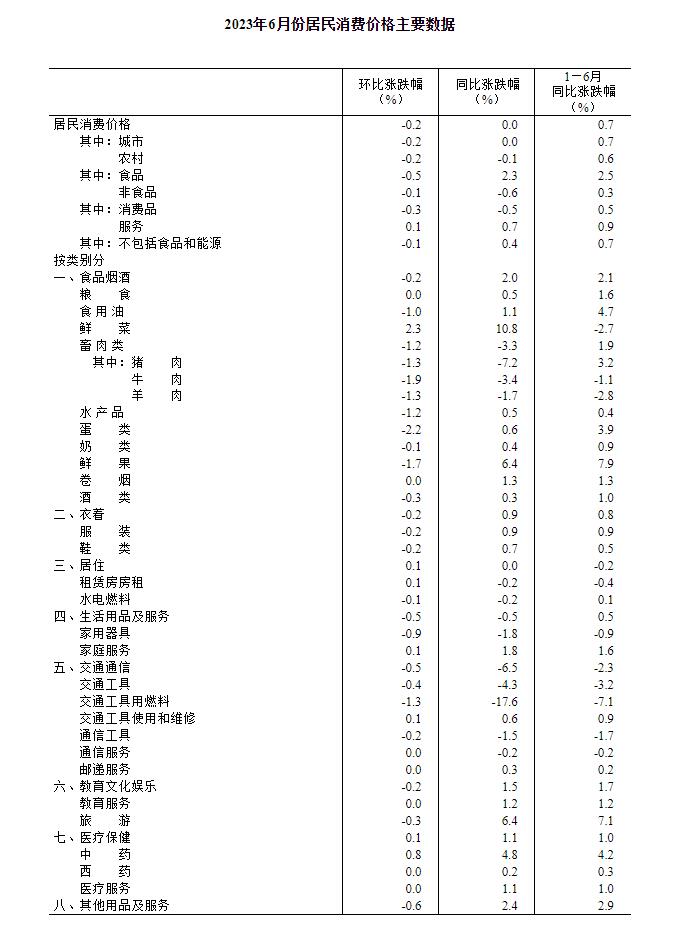 2023年6月份,全國居民消費價格同比持平。其中,城市持平,農村下降0.1%;食品價格上漲2.3%,非食品價格下降0.6%;消費品價格下降0.5%,服務價格上漲0.7%。1--—6月平均,全國居民消費價格比上年同期上漲0.7%。