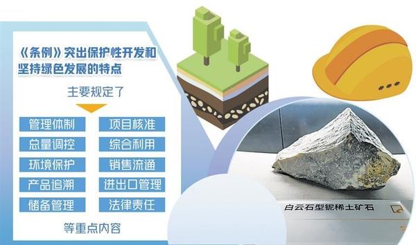 圖為包頭稀土博物館陳列的稀土礦石。新華社記者 李志鵬 攝 《稀土管理?xiàng)l例》(以下簡(jiǎn)稱(chēng)《條例》)日前公布,自2024年10月1日起施行?!稐l例》明確,稀土資源屬于國(guó)家所有,國(guó)家依法加強(qiáng)對(duì)稀土資源的保護(hù),對(duì)稀土資源實(shí)行保護(hù)性開(kāi)采。同時(shí),鼓勵(lì)和支持稀土產(chǎn)業(yè)新技術(shù)、新工藝、新產(chǎn)品、新材料、新裝備的研發(fā)和應(yīng)用,持續(xù)提升稀土資源開(kāi)發(fā)利用水平,推動(dòng)稀土產(chǎn)業(yè)高端化、智能化、綠色化發(fā)展。專(zhuān)家認(rèn)為,《條例》首次以行政立法形式規(guī)范稀土資源的開(kāi)發(fā)利用,主要規(guī)定了管理體制、項(xiàng)目核準(zhǔn)、總量調(diào)控、綜合利用、環(huán)境保護(hù)、銷(xiāo)售流通、產(chǎn)品追溯、進(jìn)出口管理、儲(chǔ)備管理、法律責(zé)任等重點(diǎn)內(nèi)容,突出了保護(hù)性開(kāi)發(fā)和堅(jiān)持綠色發(fā)展的特點(diǎn),對(duì)推動(dòng)稀土產(chǎn)業(yè)高質(zhì)量發(fā)展具有重大意義。規(guī)范稀土資源開(kāi)發(fā)利用稀土是現(xiàn)代工業(yè)中不可或缺的重要元素和關(guān)鍵戰(zhàn)略資源。中國(guó)有色金屬工業(yè)協(xié)會(huì)黨委書(shū)記、會(huì)長(zhǎng)葛紅林表示,稀土被譽(yù)為“工業(yè)維生素”,是高新技術(shù)產(chǎn)業(yè)和國(guó)防科技工業(yè)的關(guān)鍵原料,是關(guān)系國(guó)家安全和國(guó)民經(jīng)濟(jì)命脈的戰(zhàn)略資源,對(duì)推動(dòng)新型工業(yè)化發(fā)展具有不可替代性。中國(guó)稀土集團(tuán)黨委書(shū)記、董事長(zhǎng)敖宏介紹,稀土是改造提升傳統(tǒng)產(chǎn)業(yè)、發(fā)展戰(zhàn)略性新興產(chǎn)業(yè)和國(guó)防科技工業(yè)不可或缺的關(guān)鍵材料。隨著新能源汽車(chē)、風(fēng)力發(fā)電、智能制造等戰(zhàn)略性新興產(chǎn)業(yè)和節(jié)能電機(jī)等傳統(tǒng)產(chǎn)業(yè)改造升級(jí),全球稀土需求快速增加。近年來(lái),我國(guó)圍繞稀土行業(yè)準(zhǔn)入標(biāo)準(zhǔn)、行業(yè)整合、環(huán)境保護(hù)等方面出臺(tái)了多項(xiàng)政策措施,產(chǎn)業(yè)發(fā)展良好,帶動(dòng)建立起相對(duì)完整的產(chǎn)業(yè)體系,資源儲(chǔ)量、產(chǎn)量、消費(fèi)量、貿(mào)易量均居世界第一位,并持續(xù)加強(qiáng)稀土資源保護(hù)開(kāi)發(fā)和合理利用,為科技進(jìn)步和經(jīng)濟(jì)社會(huì)發(fā)展作出了突出貢獻(xiàn)。瞄準(zhǔn)新一輪科技革命和產(chǎn)業(yè)變革方向,我國(guó)加快稀土供給側(cè)結(jié)構(gòu)性改革,不斷開(kāi)辟發(fā)展新領(lǐng)域新賽道、塑造發(fā)展新動(dòng)能新優(yōu)勢(shì),產(chǎn)業(yè)鏈不斷完善,產(chǎn)業(yè)規(guī)模不斷擴(kuò)大,產(chǎn)品品種不斷豐富,產(chǎn)品質(zhì)量不斷提高,市場(chǎng)規(guī)模不斷擴(kuò)大,國(guó)際影響力持續(xù)提升。但稀土管理仍存在一些突出問(wèn)題,包括覆蓋全產(chǎn)業(yè)鏈的管理職責(zé)、監(jiān)管措施有待完善,產(chǎn)業(yè)創(chuàng)新能力和綠色化智能化水平亟需提高,行業(yè)秩序需要進(jìn)一步規(guī)范,整治非法開(kāi)采或非法冶煉分離、無(wú)指標(biāo)或超指標(biāo)生產(chǎn)、買(mǎi)賣(mài)非法稀土產(chǎn)品等違法行為的手段不足、處罰力度不夠。隨著行業(yè)的不斷發(fā)展,產(chǎn)業(yè)鏈條的持續(xù)延伸,稀土產(chǎn)業(yè)缺少綜合性法律法規(guī)的問(wèn)題日益凸顯,難以滿足行業(yè)高質(zhì)量發(fā)展需求。稀土行業(yè)涵蓋開(kāi)采、冶煉分離、產(chǎn)品流通、二次利用、進(jìn)出口以及儲(chǔ)備等諸多環(huán)節(jié),涉及中央政府多個(gè)管理部門(mén),亟需依法建立分工明確、密切配合的管理體制。葛紅林認(rèn)為,稀土產(chǎn)業(yè)大而不強(qiáng)、全而不精的問(wèn)題依然存在,在制度保障銜接、資源保護(hù)性開(kāi)發(fā)、原始基礎(chǔ)創(chuàng)新、行業(yè)秩序規(guī)范等方面仍面臨一些困難和挑戰(zhàn)?!疤貏e是在工藝綠色化、產(chǎn)品高端化、制造智能化方面有待提升,產(chǎn)業(yè)結(jié)構(gòu)要持續(xù)優(yōu)化,產(chǎn)業(yè)秩序需要進(jìn)一步規(guī)范?!卑胶暾f(shuō)。推進(jìn)產(chǎn)業(yè)轉(zhuǎn)型升級(jí)包鋼(集團(tuán))公司黨委常委、副總經(jīng)理兼北方稀土黨委書(shū)記、董事長(zhǎng)劉培勛認(rèn)為,《條例》為解決制約產(chǎn)業(yè)高質(zhì)量發(fā)展的堵點(diǎn)、難點(diǎn)開(kāi)出了法治良方。完善了生態(tài)環(huán)境保護(hù)、資源儲(chǔ)備的有關(guān)規(guī)定,形成了更加科學(xué)有效的管理方式,更有利于稀土資源的保護(hù)性開(kāi)發(fā);明確提出國(guó)家鼓勵(lì)科技創(chuàng)新和人才培養(yǎng),支持稀土新產(chǎn)品、新材料、新工藝的研發(fā)和產(chǎn)業(yè)化,更有利于稀土資源的高質(zhì)化利用;建立起從國(guó)家到地方再到企業(yè)分層管理、各司其職、各負(fù)其責(zé)的治理體系,并首次對(duì)違法違規(guī)行為設(shè)定處罰標(biāo)準(zhǔn),進(jìn)一步加壓引導(dǎo)行業(yè)秩序整頓,更有利于行業(yè)規(guī)范化管理?!稐l例》致力于促進(jìn)稀土產(chǎn)業(yè)高質(zhì)量發(fā)展。工業(yè)和信息化部原材料工業(yè)司