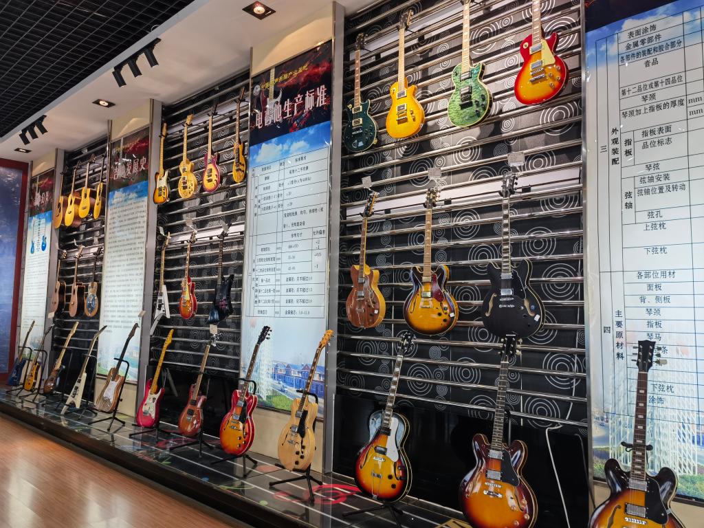 在鄌郚樂(lè)器產(chǎn)業(yè)發(fā)展中心,各式電吉他陳列其中。新華社記者 王志 攝