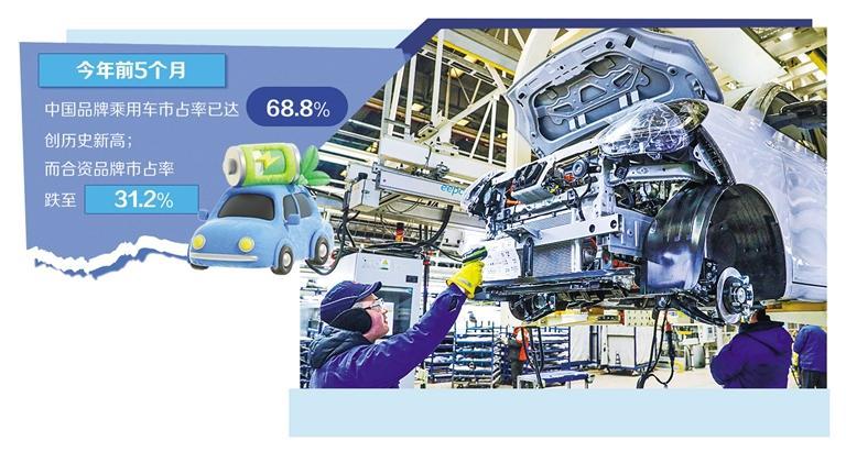 電動(dòng)化與智能化變革浪潮,不僅在加速汽車產(chǎn)品進(jìn)化,也在深刻重構(gòu)市場(chǎng)競(jìng)爭格局。中汽協(xié)數(shù)據(jù)顯示,今年前5個(gè)月,中國品牌乘用車市占率已達(dá)68.8%,創(chuàng)歷史新高;而合資品牌市占率跌至31.2%,創(chuàng)出新低。