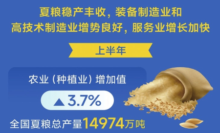 夏糧穩(wěn)產(chǎn)豐收,裝備制造業(yè)和高技術(shù)制造業(yè)增勢(shì)良好,服務(wù)業(yè)增長(zhǎng)加快。上半年,農(nóng)業(yè)(種植業(yè))增加值同比增長(zhǎng)3.7%,全國(guó)夏糧總產(chǎn)量14974萬(wàn)噸;全國(guó)規(guī)模以上工業(yè)增加值同比增長(zhǎng)6.4%,其中裝備制造業(yè)增加值同比增長(zhǎng)10.2%,高技術(shù)制造業(yè)增加值增長(zhǎng)9.5%,增速分別快于全部規(guī)模以上工業(yè)3.8和3.1個(gè)百分點(diǎn);服務(wù)業(yè)增加值同比增長(zhǎng)5.5%,比一季度加快0.2個(gè)百分點(diǎn)。