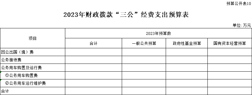 三、“三公”經(jīng)費:指省直部門用一般公共預算安排的因公出國(境)費用、公務用車購置及運行費和公務接待費。其中:因公出國(境)費用反映單位公務出國(境)的國際旅費、國外城市間交通費、住宿費、伙食費、培訓費、公雜費等支出;公務用車購置費反映公務用車購置支出(含車輛購置稅、牌照費);公務用車運行維護費反映單位按規(guī)定保留的公務用車燃料費、維修費、過路過橋費、保險費、安全獎勵費用等支出;公務接待費反映機關和參公事業(yè)單位按規(guī)定開支的各類公務接待(含外賓接待)支出。