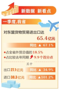 本報訊(記者孟婷)5月15日,記者從太原海關獲悉,今年一季度,我省對東盟貨物貿易進出口達65.4億元,同比增長67.1%,占全省外貿總值的18.5%,占比較去年同期提升9.9個百分點。其中,出口27.1億元,同比增長34.9%;進口38.3億元,同比增長101.2%。3月份,我省對東盟進出口25.8億元,同比增長101.4%,其中出口11億元,同比增長50%;進口14.8億元,同比增長169.6%。