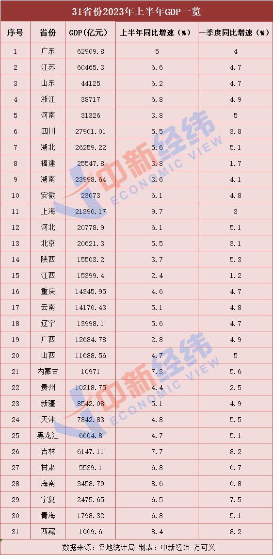 中新經(jīng)緯7月31日電 (萬可義)截至7月30日,31省份2023年上半年GDP數(shù)據(jù)已全部出爐??偭糠矫?,粵蘇魯穩(wěn)居前三;增速方面,15省份高于“全國線”,上海勢頭最猛,增速達(dá)到9.7%。