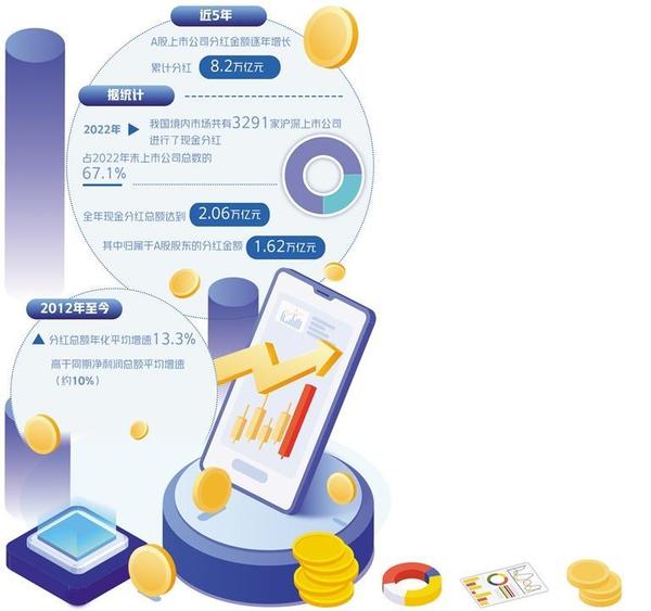 近5年,A股上市公司分紅金額逐年增長,累計(jì)分紅8.2萬億元。據(jù)統(tǒng)計(jì),2022年,我國境內(nèi)市場共有3291家滬深上市公司進(jìn)行了現(xiàn)金分紅,占2022年末上市公司總數(shù)的67.1%,全年現(xiàn)金分紅總額達(dá)到2.06萬億元,其中歸屬于A股股東的分紅金額1.62萬億元。國際比較來看,境內(nèi)市場分紅上市公司數(shù)量在全球主要證券市場中位居第一,現(xiàn)金分紅總額位列全球第二,分紅家數(shù)占比位列全球第二。此外,有163家上市公司公布2023年半年報(bào)現(xiàn)金分紅預(yù)案,預(yù)計(jì)分紅2030.1億元。