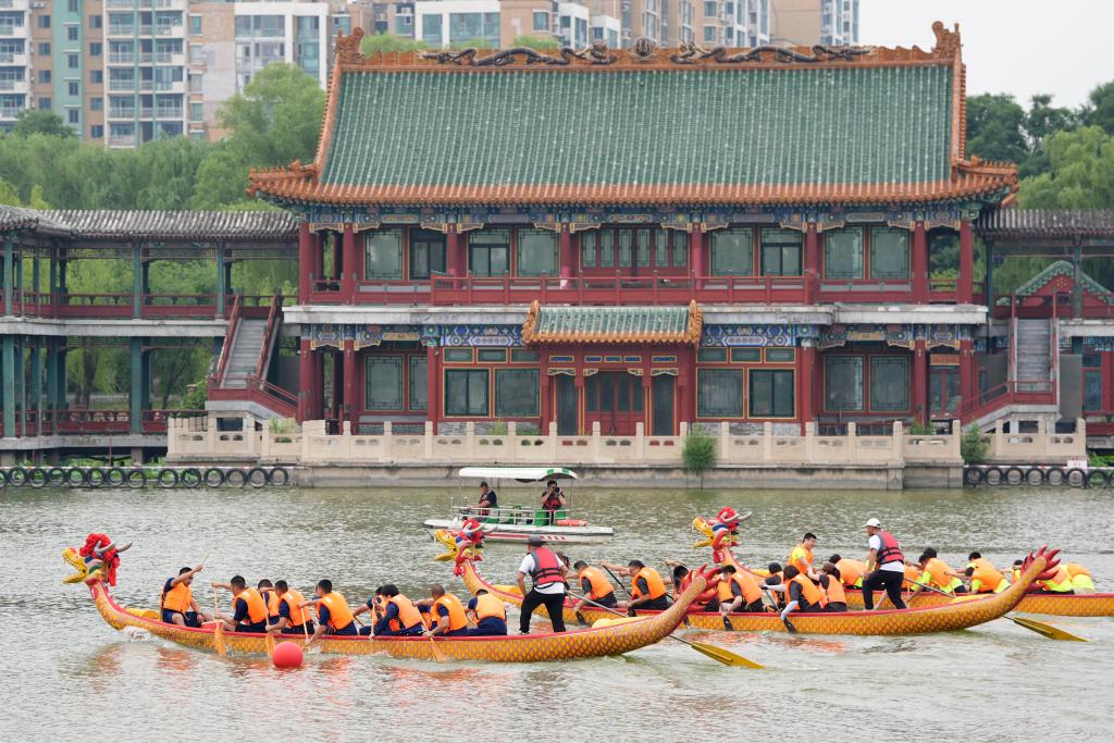 6月5日,2024龍?zhí)抖宋缥幕?jié)活動(dòng)在北京市東城區(qū)龍?zhí)豆珗@舉辦。這是2024龍?zhí)抖宋缥幕?jié)龍舟比賽現(xiàn)場。新華社記者 鞠煥宗 攝