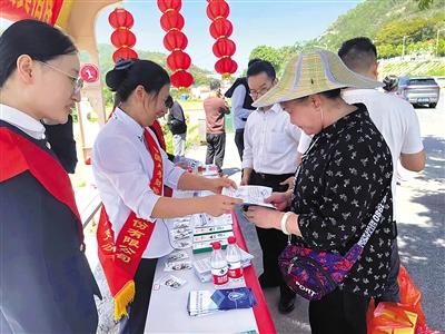福建省福清市一家保險機構在石竹山景區(qū)向游客宣傳保險知識。 盧燕 攝