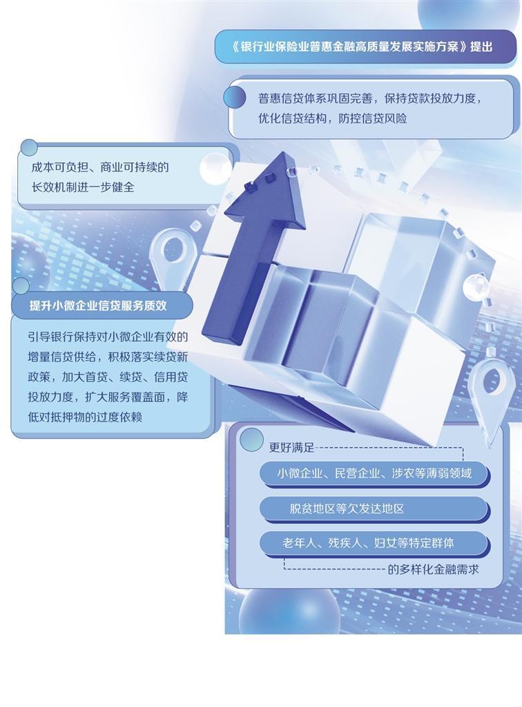 近年來(lái),我國(guó)普惠金融發(fā)展取得長(zhǎng)足進(jìn)步,金融服務(wù)的普惠性不斷提升。近期印發(fā)的《銀行業(yè)保險(xiǎn)業(yè)普惠金融高質(zhì)量發(fā)展實(shí)施方案》(以下簡(jiǎn)稱(chēng)《實(shí)施方案》)在主要目標(biāo)中提出,普惠信貸體系鞏固完善,保持貸款投放力度,優(yōu)化信貸結(jié)構(gòu),防控信貸風(fēng)險(xiǎn),成本可負(fù)擔(dān)、商業(yè)可持續(xù)的長(zhǎng)效機(jī)制進(jìn)一步健全,更好滿(mǎn)足小微企業(yè)、民營(yíng)企業(yè)、涉農(nóng)等薄弱領(lǐng)域,脫貧地區(qū)等欠發(fā)達(dá)地區(qū)以及老年人、殘疾人、婦女等特定群體的多樣化金融需求。