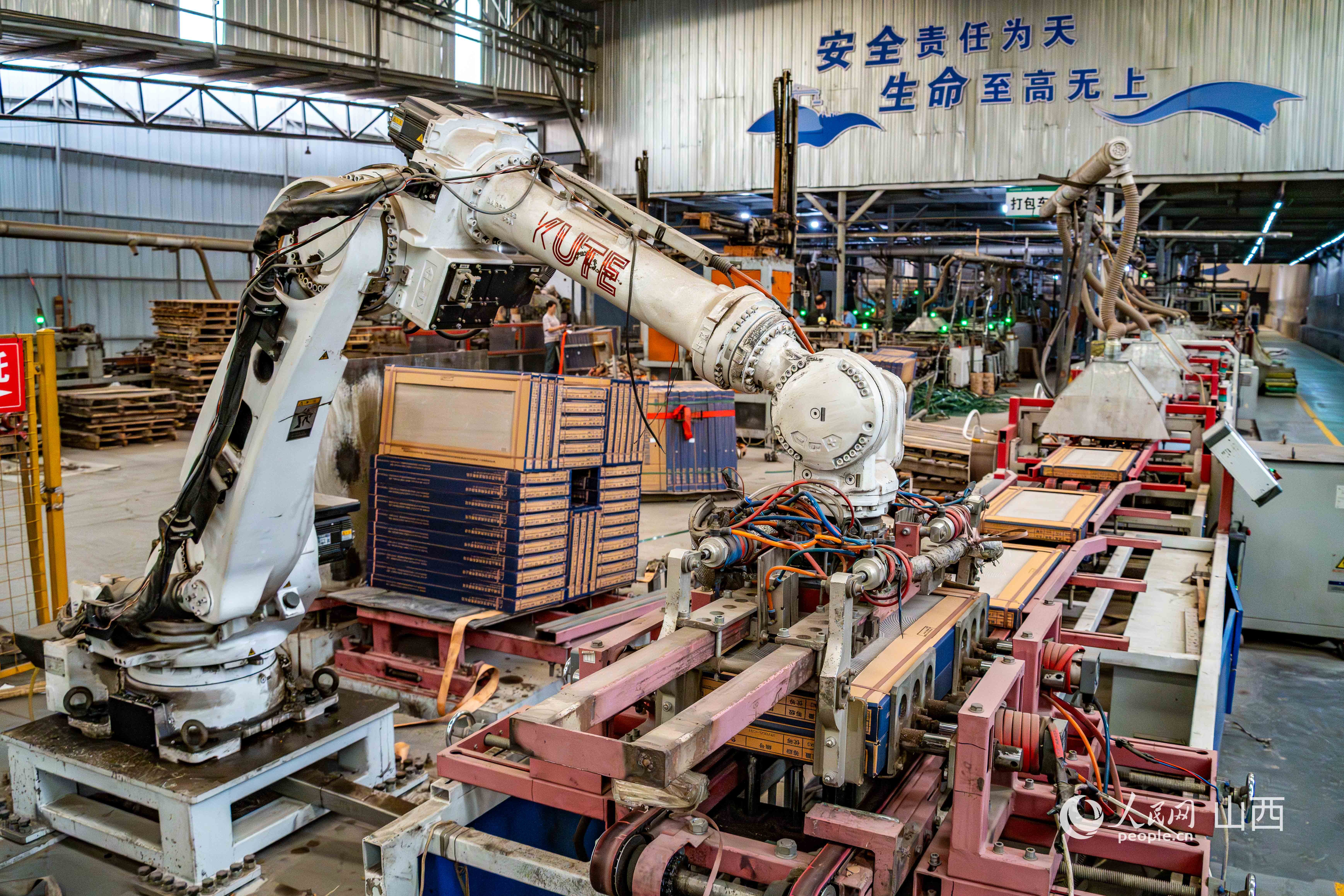華冠陶瓷有限公司的生產(chǎn)車間,機(jī)械臂正在打包裝箱。人民網(wǎng) 馬夢(mèng)迪攝