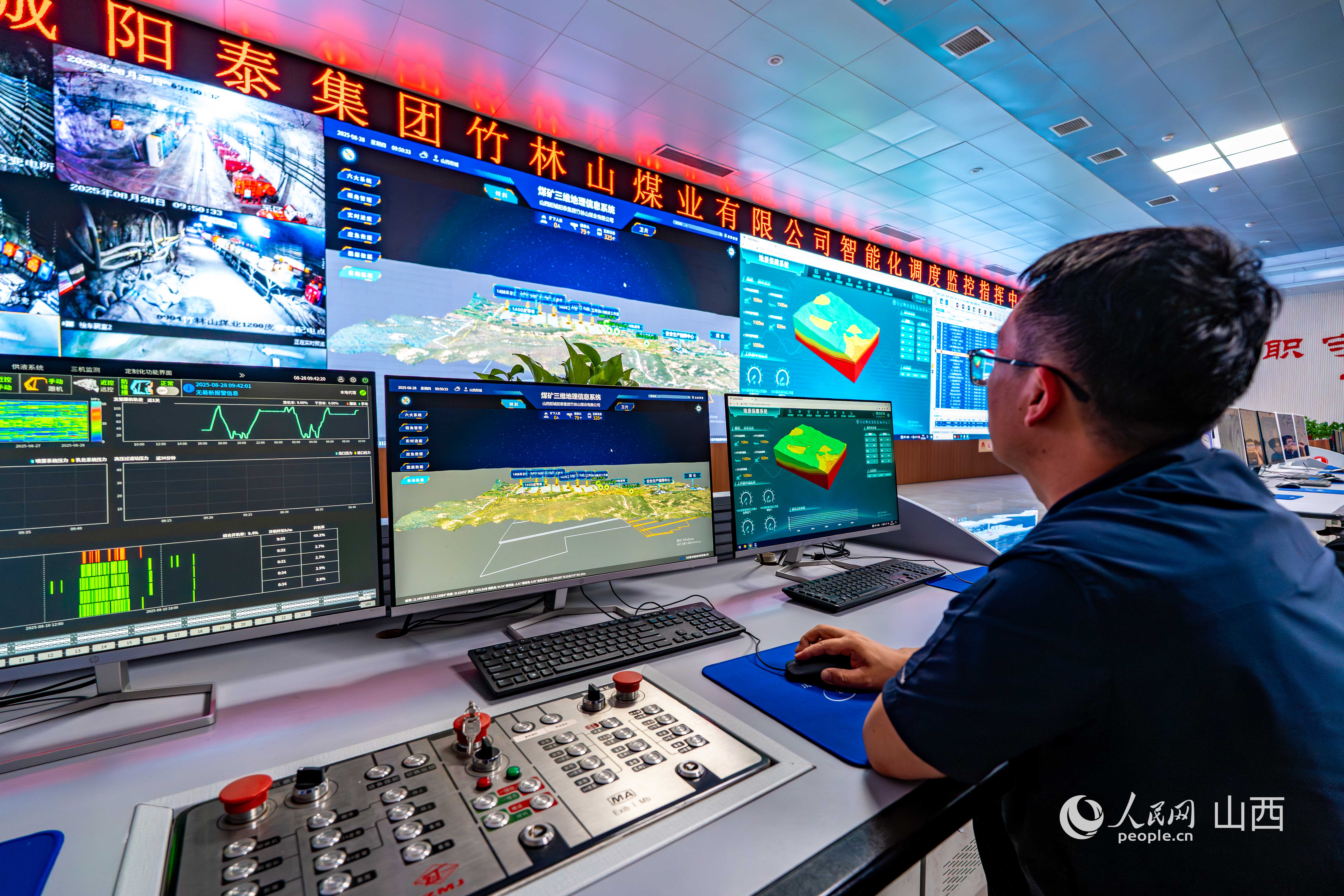 陽(yáng)泰集團(tuán)竹林山煤業(yè)有限公司智能化調(diào)度監(jiān)控指揮中心。人民網(wǎng) 馬夢(mèng)迪攝