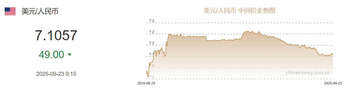 中新網9月23日電 據(jù)中國外匯交易中心網站消息,中國人民銀行授權中國外匯交易中心公布,2025年9月23日銀行間外匯市場人民幣匯率中間價為:1美元對人民幣7.1057元,上調49個基點。
